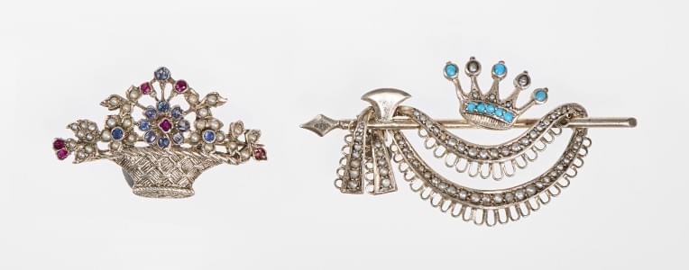 3157. Lot de deux broches, l'une à motif de couronne sertie de turquoi...