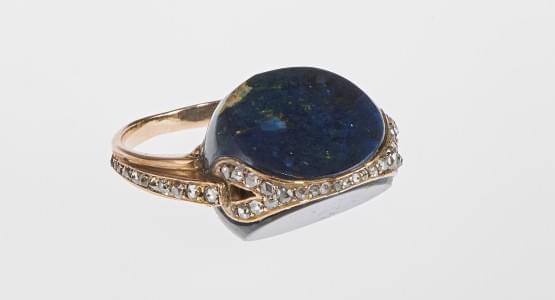 3175. Bague sertie d'un lapis-lazuli poli rehaussé d'une ligne de rose...