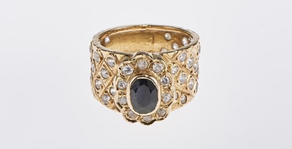 3187. Bague sertie d'un saphir ovale et pavée de pierres d'imitation p...