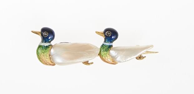 3194. Broche à motif de deux colverts émaillés sertis chacun d'une per...