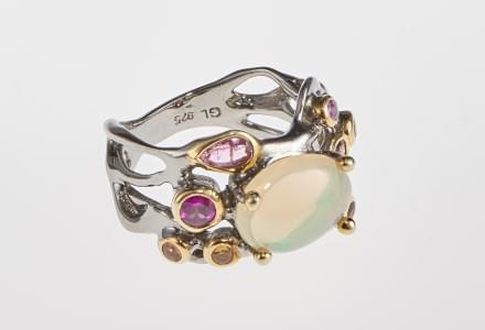 3311. Bague sertie d'une opale ovale taille cabochon entourée de pierr...