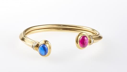3327. Bracelet jonc ouvert serti d'un saphir et d'un rubis en cabochon...
