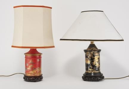 3387. Deux lampes à décor or au chinois sur fond noir et rouge