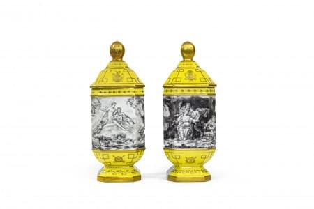 3388. Paire de pots couverts à décor néoclassique or sur fond jaune et...