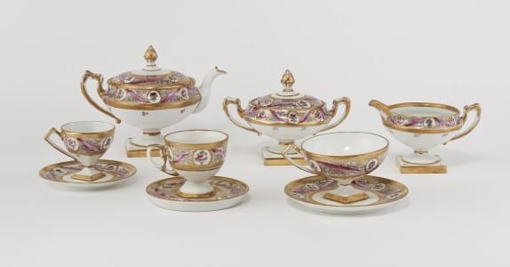 Porcelaine peinte, D. Brandt, comprenant: plateau, théière, sucr...