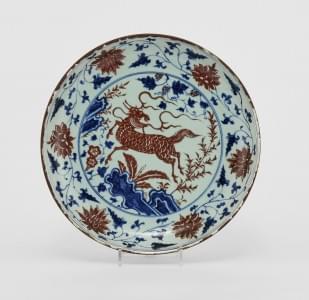 Porcelaine émaillée rouge et bleu à motifs de qilin, D 37 cm. Pr...