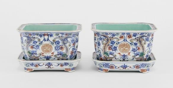 Porcelaine émaillée bleu blanc à décor de vases et scènes animée...