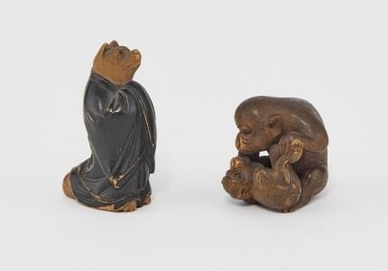 675. Deux netsukes, l'un formé de deux singes, l'autre d'un loup drap...