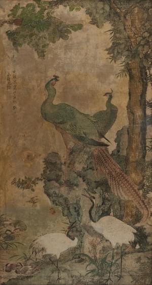 Paons et grues, encre et aquarelle sur papier, 79x42 cm