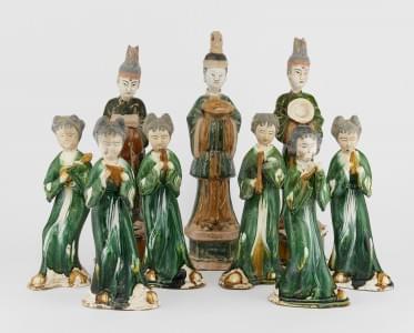 696. Neuf statuettes de dignitaires et danseuse, Chine, dans le style...
