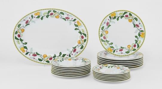Faïence fine, comprenant: 12 assiettes à dîner, 6 assiettes à sa...
