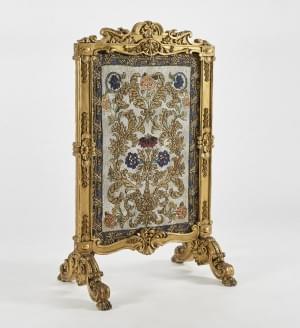 Bois sculpté et doré, broderie de perles et soie à motifs d'acan...