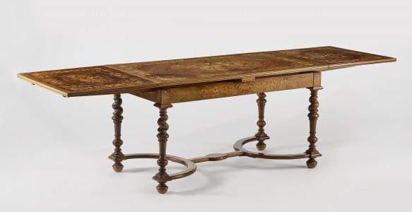 Bois fruitier à décor marqueté de fleurs, rallonges à l'italienn...