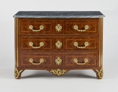 Trois tiroirs, placage de bois précieux, bronze doré et marbre,...