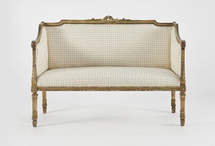 Bois sculpté et doré, soierie à carreaux, L 120 cm. Provenance:...