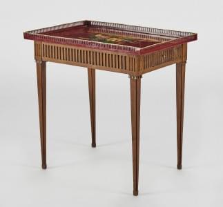 Bois fruitier, plateau en tôle à galerie à décor de fleurs sur f...
