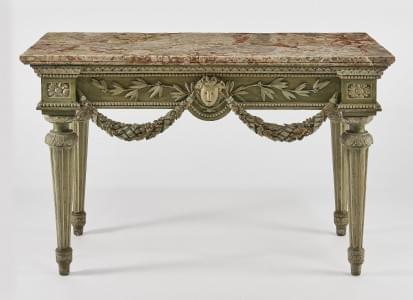 Bois vert rechampi vert, marbre pêche, 88x135x66 cm