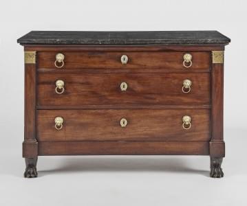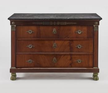 Trois tiroirs, acajou, laiton et marbre gris, 80x110x52 cm