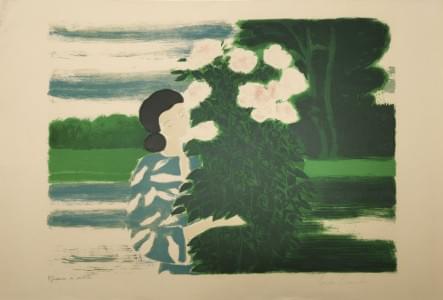 Jeune femme et fleurs, estampe en couleur, épreuve d'artiste sig...