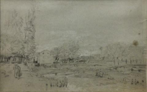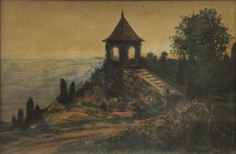 Paysage avec tourelle, aquarelle sur carton, 16,5x25 cm