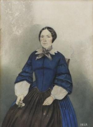 Jeune femme en robe bleue, aquarelle, datée 1859, 20x15 cm. Prov...