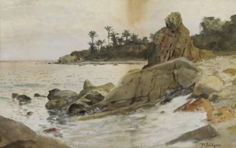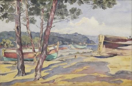 Barques sous les pins, aquarelle, signée C. Dunant, 30x47 cm