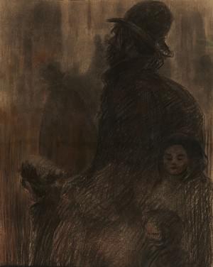 Homme et enfants, pastel gras sur papier, 52x42 cm