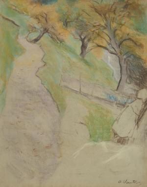 Chemin dans un verger en Valais, pastel sur papier signé, 58x45...