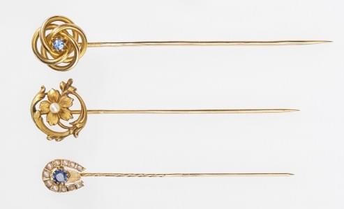 L'une Art nouveau à décor floral centré d'une perle, l'une à mot...