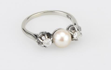 3253. Bague sertie d'une perle épaulée de deux diamants sur châton ill...