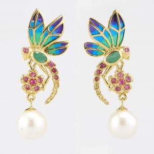 L'une émaillée à motif de libellules aux corps sertis d'émeraude...