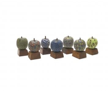 A décor millefiori sur fond rouge et bleu, D 8 et 9 cm