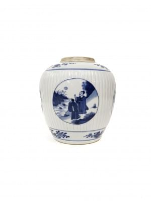 Porcelaine bleu blanc à motifs de scènes animées en réserves, H...