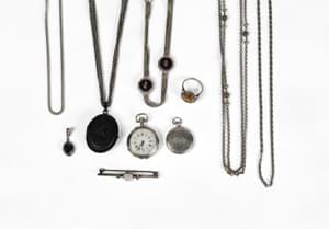 Trois colliers, trois broches et un anneau, métal et métal doré,...