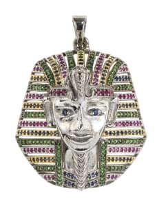3014. *Pendentif à motif d'une tête de pharaon pavée d'émeraudes, de s...