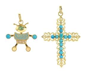 L'un à motif de croix ajourée sertie de turquoises et l'autre à...