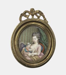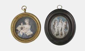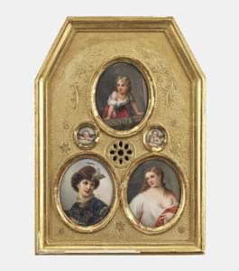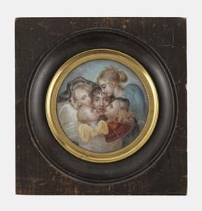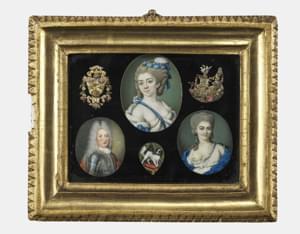 Trois portraits, un chien, et deux trophées allégoriques, miniat...