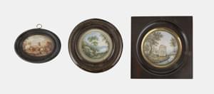 Paysage, trois miniatures à la gouache et végétaux collés, dim....