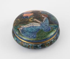 Boîte à décor d'une femme assise sur une prairie, métal émaillé,...