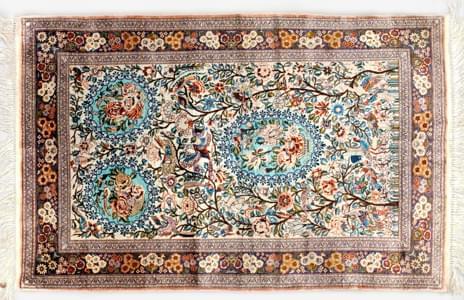 Laine et soie à motifs de rinceaux et oiseaux, bordure à décor d...