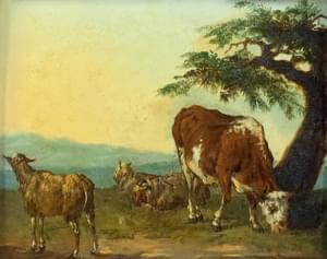 Vaches, huile sur panneau, 20x26 cm. Ancienne attribution au dos...