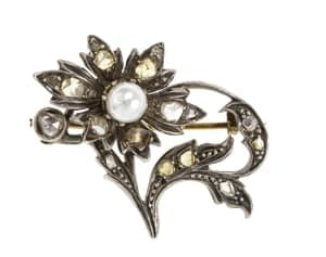 3102. *Broche à motif d'une fleur centrée d'une perle (D 5 mm) et reha...
