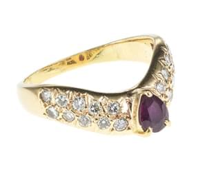 3112. Bague sertie d'un rubis taille poire épaulée de pavages de diama...
