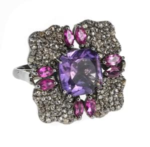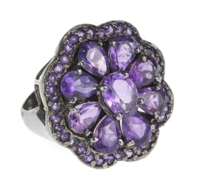 3122. Bague fleur centrée d'une améthyste taille ovale, entourée d'amé...