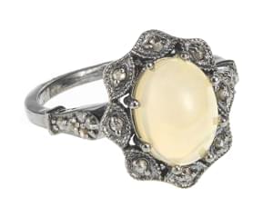 3127. *Bague sertie d'une opale à fond blanc taille cabochon ovale ent...