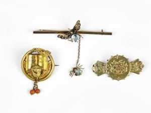 L'une retenant des perles de corail en pendeloque et datée de 18...