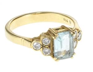 3174. Bague sertie d'une aigue-marine taille émeraude (env. 2 ct) épau...