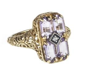 3195. *Bague centrée d'un petit diamant entouré de quatre améthystes t...