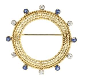 3303. Broche ronde ajourée entourée d'une alternance de saphirs et de...