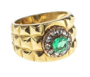 3384. Bague centrée d'un motif sertie d'une émeraude taille poire (env...
